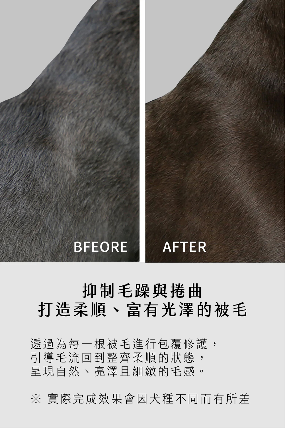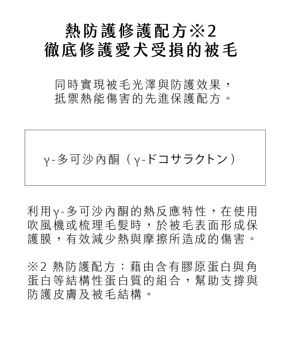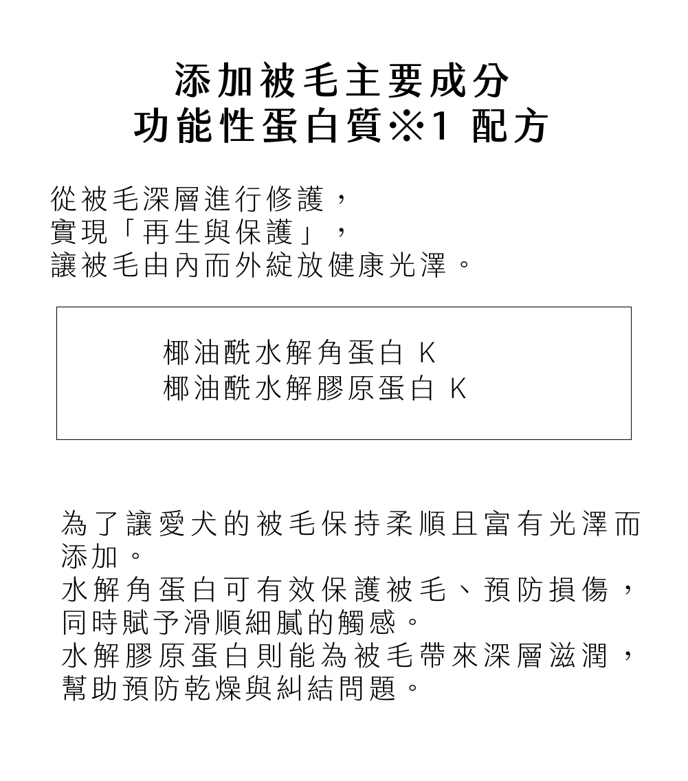 水解膠原蛋白能深層滋潤,防止乾燥與糾結,使被毛維持健康彈性。
