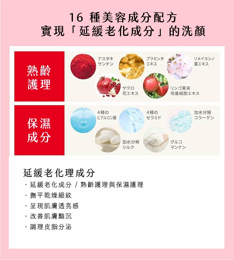搭配胎盤素萃取、染井吉野櫻葉萃取、蘋果果實培養細胞萃取,以及保濕不可或缺的玻尿酸與神經醯胺,一邊清除髒汙,一邊溫柔陪伴熟齡肌的多重困擾。